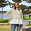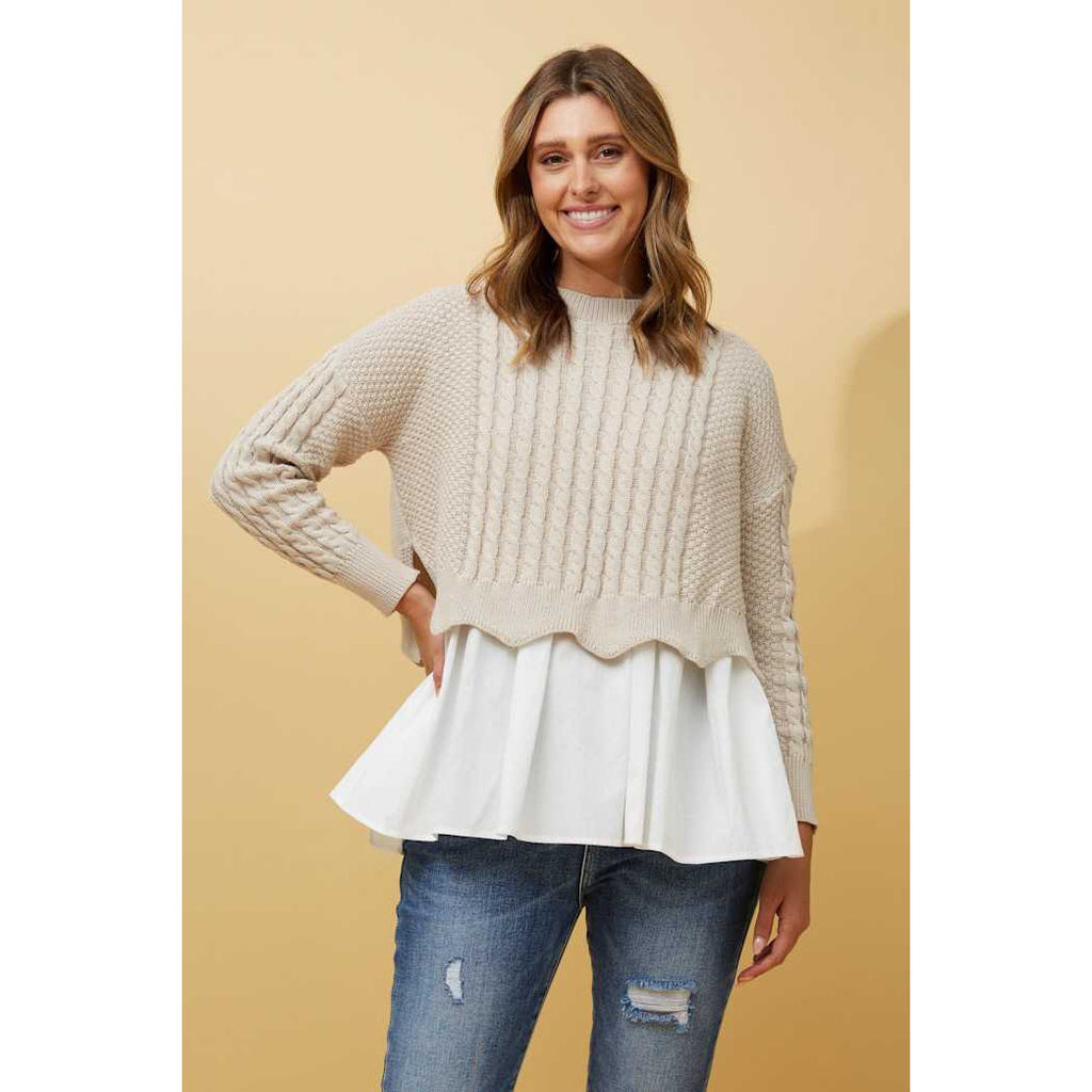 This half knit jumper with a blouse bottom in khaki offers a stylish layered look without the bulk. Soft and comfortable, it’s perfect for everyday wear, providing warmth while maintaining a polished appearance. The blouse bottom adds a feminine touch, making it easy to dress up or down for any occasion.