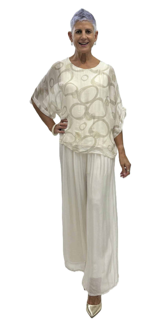 Experience the refined elegance of our loose top, meticulously crafted with a luxurious blend of 30% silk and 70% viscose. The panna circle print evokes a sense of sophistication and exclusivity, elevating this premium piece to a new level.
