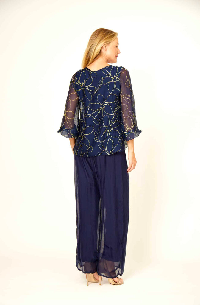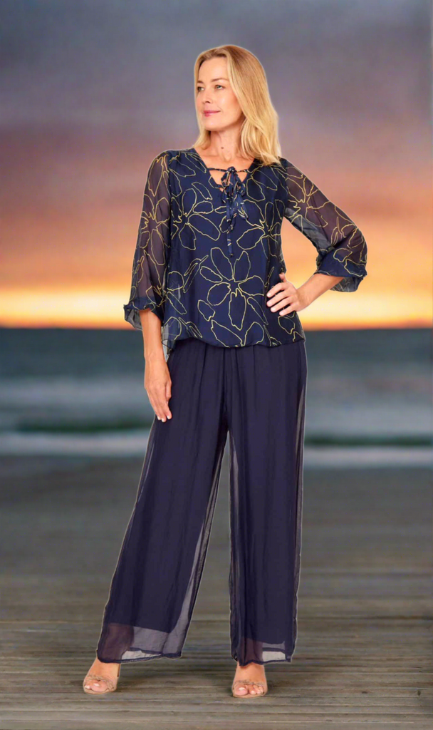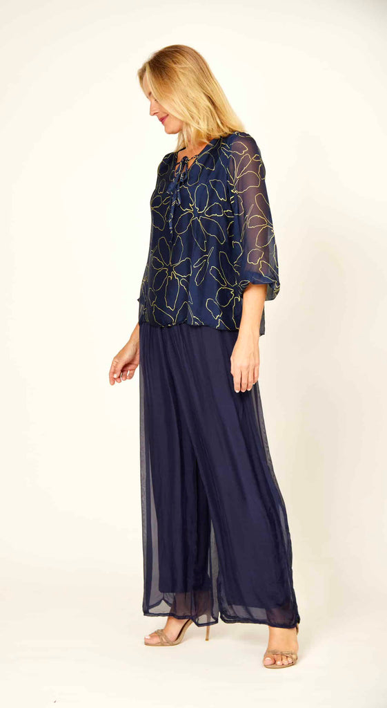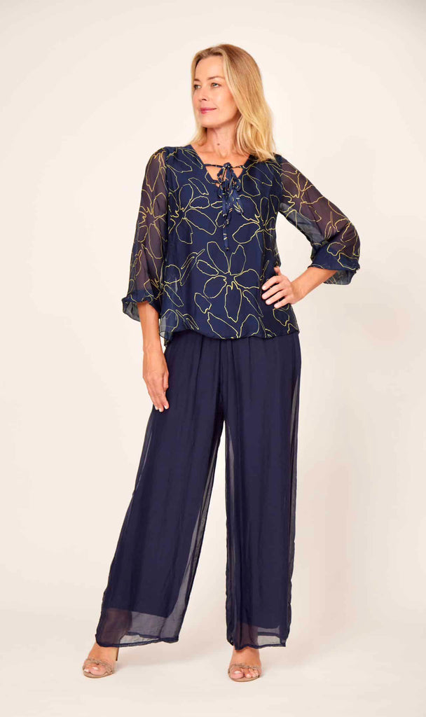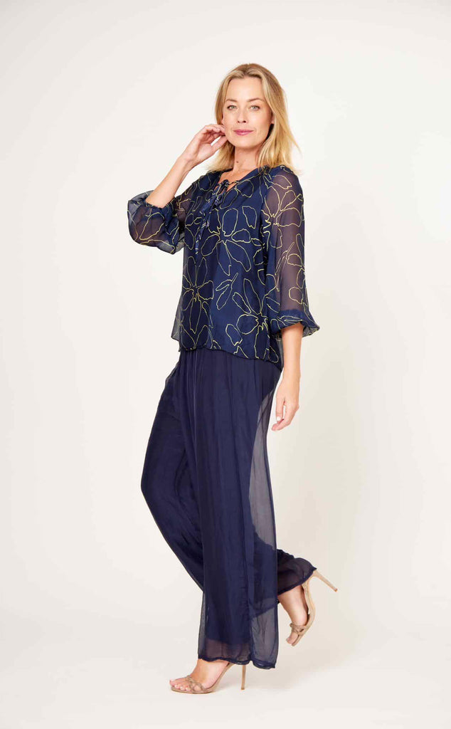 Elevate your wardrobe with our V-Neck Tied Top in navy and gold print. Made with a luxurious blend of 30% silk and 70% viscose, this top features a flattering v-neckline and a tied detail for a touch of elegance. Perfect for both casual and dressy occasions.