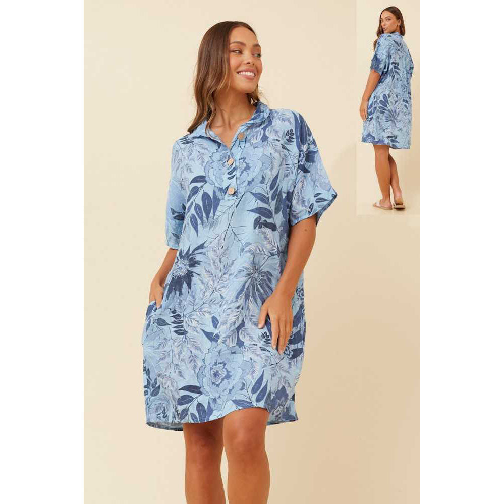Effortlessly elegant, this blue linen shirt dress combines timeless style with everyday practicality. Crafted from breathable linen fabric, it drapes beautifully while maintaining its structured silhouette. The classic shirt collar and button-front design offer versatile styling options, while functional pockets add a touch of modern convenience. Perfect for warm weather dressing, this piece transitions seamlessly from casual daytime wear to refined evening occasions. A wardrobe essential that embodies understated sophistication.