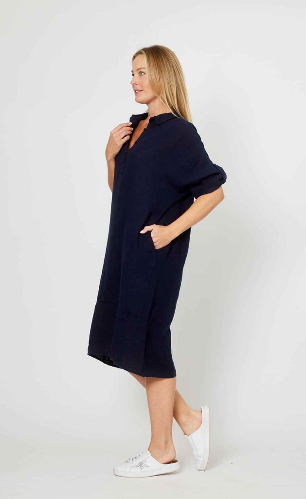 This navy linen dress strikes the perfect balance between relaxed and refined. Made from 100% pure linen, it's naturally breathable and comfortable for everyday wear. The front button-down design lets you adjust the neckline to suit your mood, while the metal ring accent at the back adds an understated edge. Throw it on with sneakers for casual outings or pair it with simple jewellery for a more polished look—versatility that works season after season.