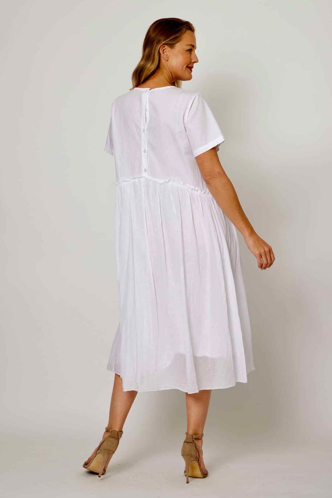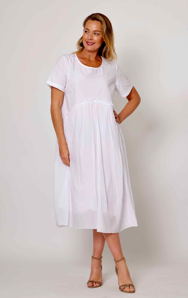 Meet your new go-to dress! This crisp white cotton number features a chic empire waistline that's seriously flattering, plus a clever button-up back that adds personality to every wear. Whether you're grabbing coffee, heading to brunch, or just living your best casual life, this versatile piece has you covered. Soft, breathable, and endlessly stylish—what's not to love?