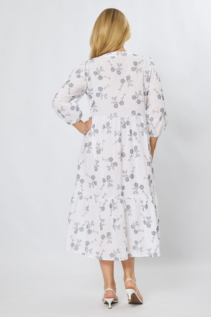 Effortlessly elegant, this cotton printed dress showcases a timeless white and Navy floral design that transitions seamlessly from day to evening. Crafted from 100% pure cotton, it offers breathable comfort and a refined drape that flatters the silhouette. The classic floral print adds visual interest while maintaining understated sophistication, making it an essential piece for any wardrobe. Perfect for casual outings or dressed up with accessories for special occasions.