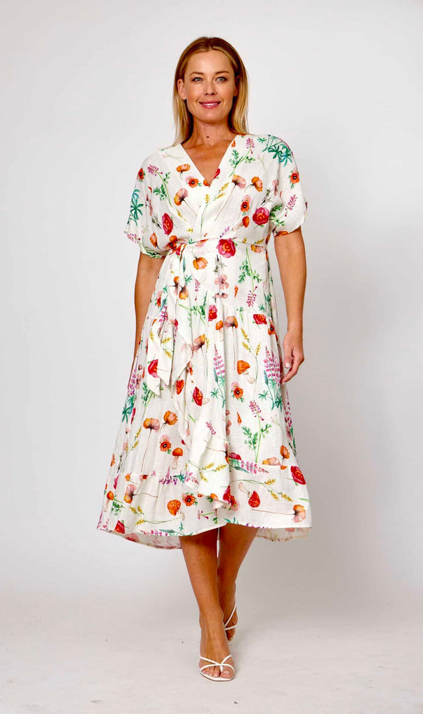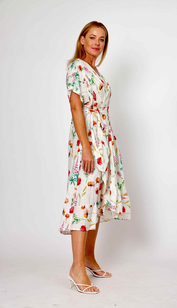 Effortlessly elegant, this wrapped dress combines breathable linen with fluid viscose in a timeless cream base adorned with delicate pink florals. The sophisticated drape of the wrap silhouette flatters the figure while the natural fabric blend ensures comfort throughout the day. Perfect for transitioning from casual gatherings to refined occasions, this piece embodies understated luxury and versatile style.