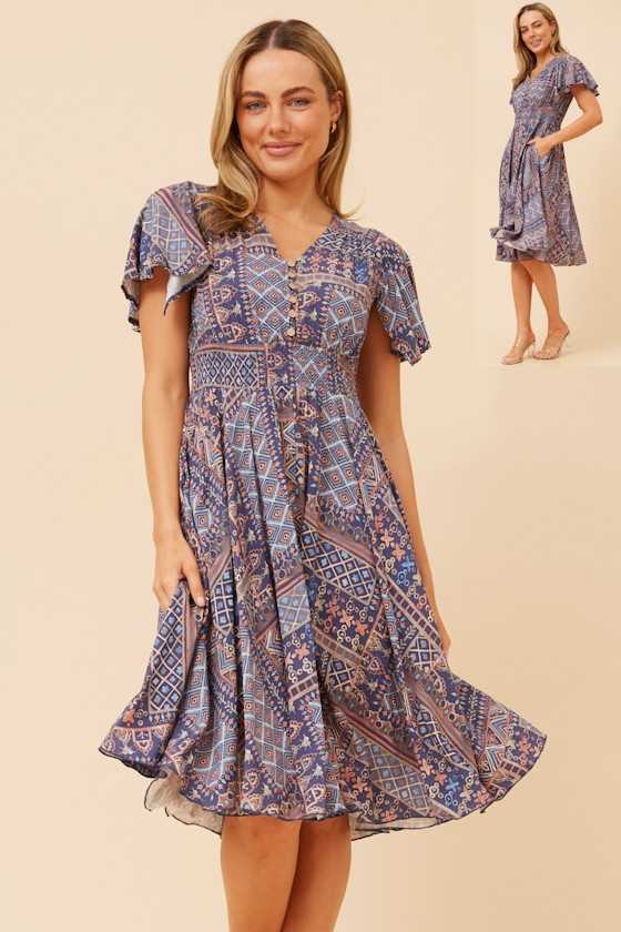 Short Ruffle Sleeve Patchwork Dress - Blue