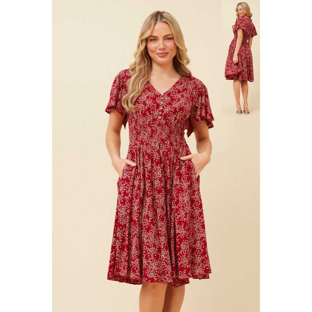 V-Neck Ruffle Sleeve Dress - Red