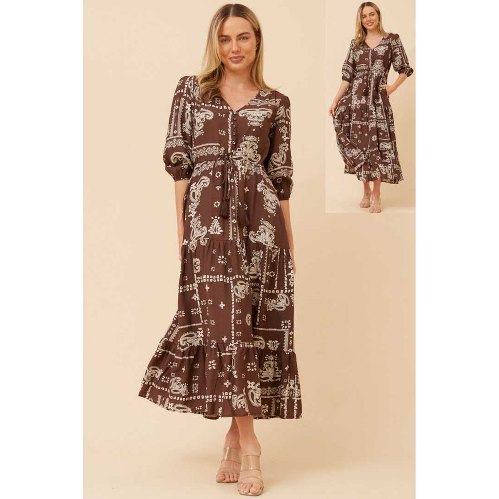 Elevate your wardrobe with this chocolate maxi dress, featuring a flattering tie waist and elegant 3/4 sleeves. Dress it up with boots for a sophisticated evening vibe, or keep it casual with sandals for daytime adventures. The perfect piece that transitions seamlessly from day to night, this versatile dress is ready for whatever your schedule throws at you.