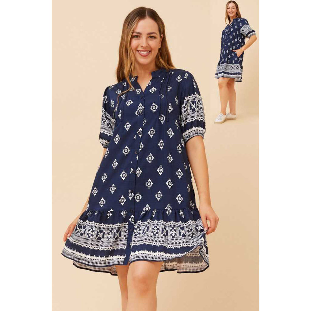 The dress features a stylish border print that adds a touch of elegance! Ideal for a casual day out or a weekend getaway, pair it with sandals for a relaxed yet stylish look!